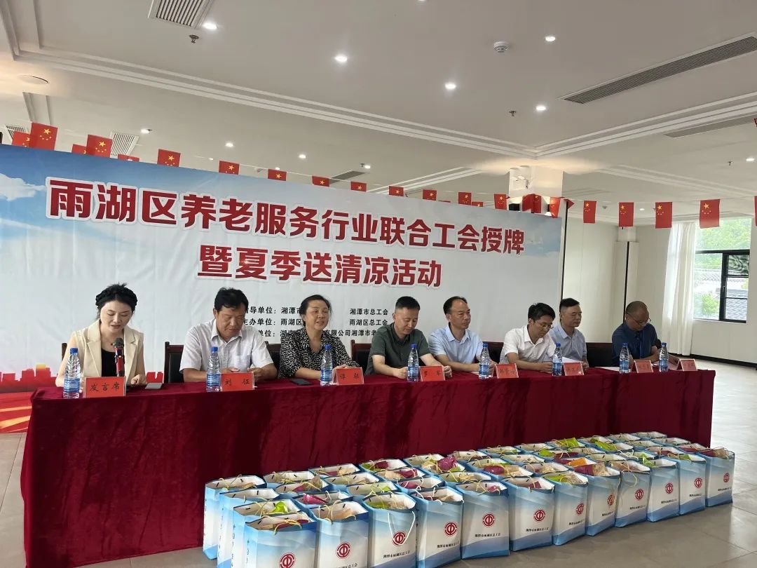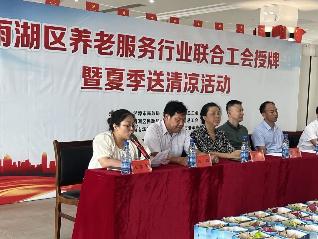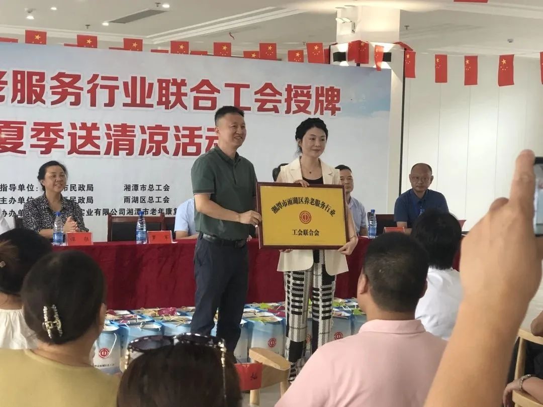8月23日,雨湖區(qū)養(yǎng)老服務(wù)行業(yè)聯(lián)合工會授牌儀式暨夏季送清涼活動在我院舉行。區(qū)總工會黨組書記、常務(wù)副主席劉征,人大常委會副主任、區(qū)總工會主席譚聯(lián),市總工會黨組成員、副主席羅軍,湘潭市民政局黨委委員、副局長韓賢海,雨湖區(qū)委副書記蔣文武,市工會組織部部長劉志勇,以及來自雨湖區(qū)各養(yǎng)老機構(gòu)的負責(zé)人代表參會,雨湖區(qū)民政局黨組書記、局長干建暉主持會議,華遠康養(yǎng)中心法人譚燦任首屆工會主席。